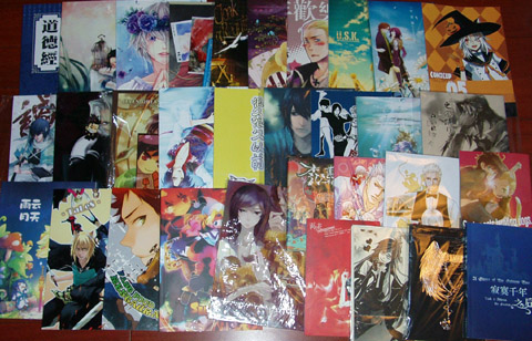 最上面一排三字母以及一本排错位的蛋蛋和场刊一本(CC没场刊,有袋子,不过这次只挂本,不挂周边),万恶的老龙家新刊也没什么可看的,就是图新鲜啊图新鲜……旁边一排三字母应该都属于大手,至少我还算看得顺眼?有家人家的国母可强气了,功德满点非常好。二缺旁边是回溯之歌,没看,画风有爱XD,二缺,也让我见识一下神本吧,虽然没胆在那家门口买本OTZ,USK是因为开场后惠姑娘去排队了于是跟风买了(你就这德行),本子厚度很赞,而且是全图,冲这个也很值得,但是惠姑娘还是买了和绘本一同出的文本(可惜在发现文本残了后没有换到只好退掉了OTZ),还需要排队买特典海报!天那OTZ(对不起三字母我一本没看OTZ)